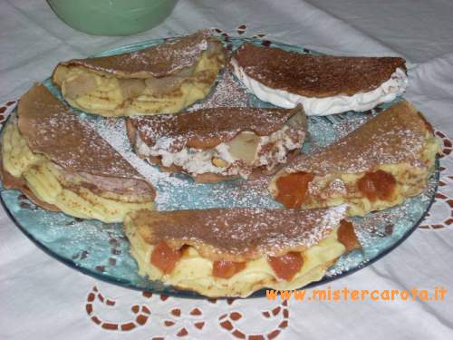 crema pasticcera + panna montata (crema chantilly) + pezzetti di frutta pesche o pere o a piacere (cotta con un pochino di burro ed un cucchiaio di zucchero)