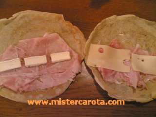 Una volta preparate le crespelle, riempitele con una fetta di prosciutto e fettine di Brie' o di Emmenthal,