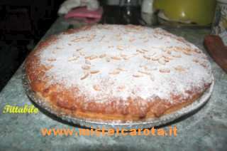 Stendo metà della frolla in una tortiera imburrata, metto la crema fredda quindi un altro disco di frolla e i pinoli.