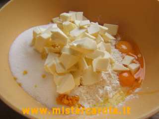 Preparare la frolla mettendo in una ciotola la farina, il burro a pezzetti, le uova, la buccia grattugiata dell'arancio e del limone, lo zucchero.