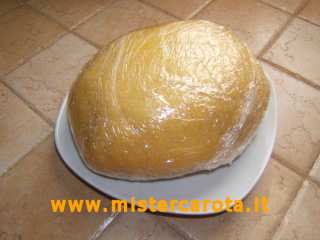 Impastare velocemente con le mani, fare una palla, avvolgerla nella pellicola e farla riposare in frigo per 1 ora circa.
