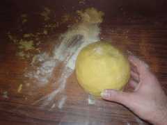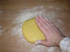 Togliere l'impasto dal frigo, togliere la pellicola, mettere l'impasto sulla spianatoia (meglio se di marmo o di metallo) e schiacciarla a forma tonda