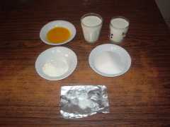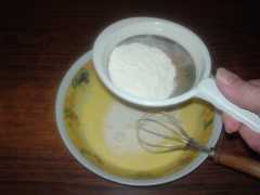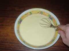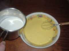 Versiamo il latte, appena bollito, a filo nella pastella con uova zucchero e farina mescolando continuamente