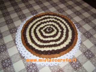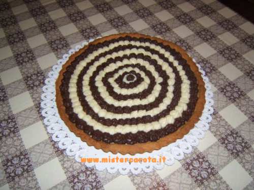 Comporre la crostata, stendere sulla base la crema pasticcera, preparare 2 sac- a-poche con le due ganache e ricoprire la superficie della crostata con le 2 ganache facendo tutti ciuffetti e alternando i 2 colori.