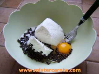 Ingredienti per la farcia: 250 gr di ricotta - 100 gr di zucchero - 1 uovo intero - 1 manciata di gocce di cioccolato - 1 pera - crema spalmabile al cacao e nocciole.