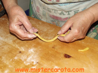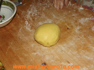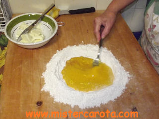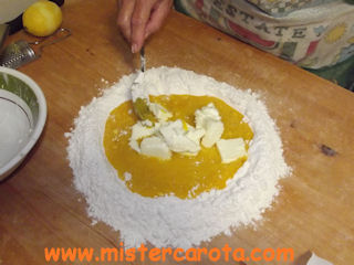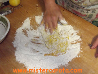 Disporre la farina setacciata a fontana, mettere nel mezzo lo zucchero, l'uovo, i tuorli, il pizzico di sale, iniziare impastare.