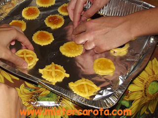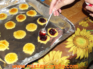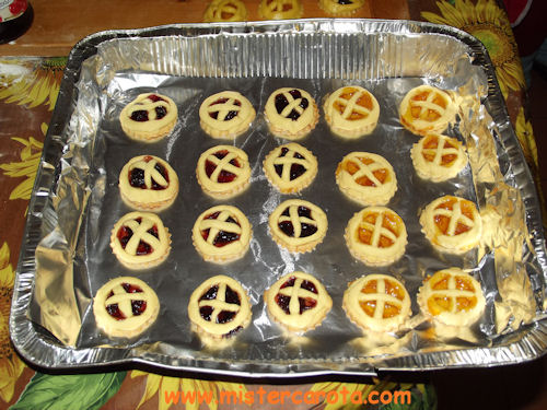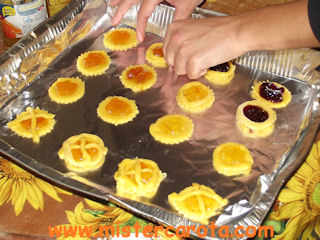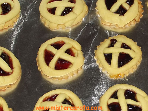 Ingredienti: da 220 a 250 gr di farina (dipende dalla grandezza delle uova) - 100 gr di burro - 100 gr di zucchero - 1 uovo - 2 tuorli - scorza grattugiata di limone - pizzico di sale - marmellate a vari gusti (albicocca, pesca, arancia, amarena...).