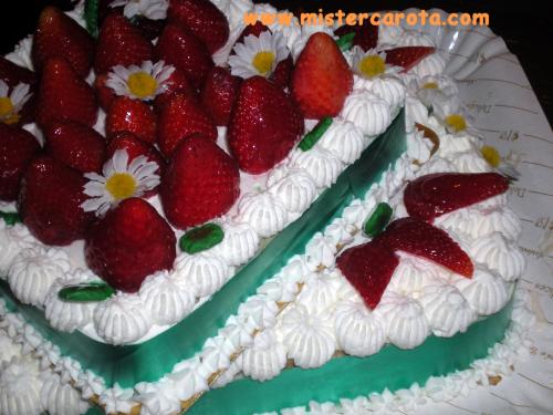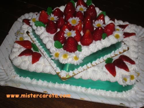 Con la panna e la sac-a-poche, ho finito di decorare le parti vuote, ho riempito la parte sueriore con le fragole intere, le ho spennellate con la gelatina calda, facendo attenzione a non toccare la panna.