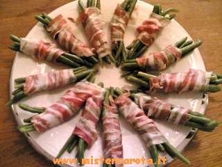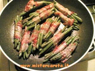 Ingredienti per 4 persone: 80 fagiolini (o cornetti) - 16 fette di pancetta tesa tagliata sottile - 25 gr. di burro - 1 cucchiaino di coriandolo (facoltativo) - sale -pepe.
