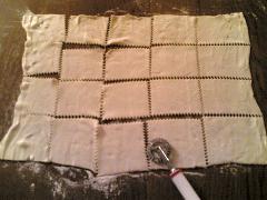 Stendete la pasta sfoglia e, con l'apposita rotellina, tagliate dei quadrati regolari, quindi cospargeteli con un pizzico di sale.