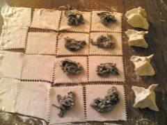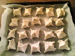 Suddividete i funghi per ogni quadrato di sfoglia, poi chiudeteli a fagottino unendo i 4 lembi e schiacciando bene i bordi.