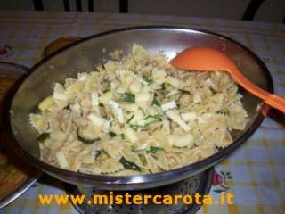 Ingredienti per 4 persone: 350 gr di farfalle - 3 zucchine piccole - tonno sott'olio sgocciolato in quantità a piacere - 100 gr di emmenthal - olio extravergine d'oliva - sale - peperoncino fresco - cipolla - erba cipollina - erba aglina.