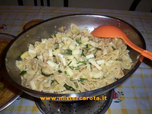 Questa è una pasta fredda molto semplice, farfalle cotte al dente e subito messe in un contenitore basso e largo a raffreddare, condite solo con un po' d'olio extra. Una volta tiepide, le condisco con le zucchine a pqzzetti saltate in padella con olio extra sale peperoncino e cipolla grattugiata aggiunta quando le zucchine sono quasi cotte, il tonno sgocciolato e tanti pezzetti di emmenthal o scamorza, un ciuffetto di erba cipollina e qualche filino di erba aglina tagliate a pezzettini.