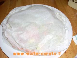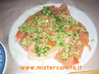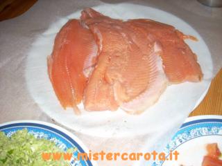 Ingredienti: filetti di trota - alcuni spicchi di aglio - un pezzettino di cipolla - 1 mazzetto di erbe fresche aromatiche composto da prezzemolo, erba cipollina, timo, origano, salvia e rosmarino - olio extravergine d'oliva - pomodoro fresco a cubettini - 1 o 2 zucchine grattugiate - buccia grattugiata di 1 limone - sale q.b.