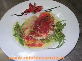 Stufare la cipolla con del burro e le bacche di ginepro. Sfumare con dell'aceto, unire lo zucchero e lasciar cuocere a fiamma bassissima. Lasciare stufare per una mezz'ora. Far stufare allo stesso modo le fragole con della cipolla, unire del sale, quindi farle cuocere fino a renderle omogenee a fiamma sempre bassissima. Dividete il filetto in 4 parti, scottatelo in padella quindi cuocete in forno a 180°C. per 5 minuti. Adagiate le cipolle nel piatto, poggiate il filetto sopra, unite la salsa di fragole quindi sale, pepe ed olio.