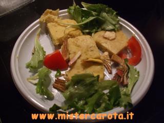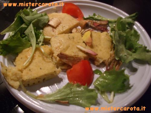 Ingredienti: 500 gr di patate - 2 uova - 2 cucchiai di farina bianca - 2 cucchiai di parmigiano grattugiato - 40 gr di burro - timo fresco - sale e pepe - 4 carciofi - 200 gr di rucola - 100 gr di pomodorini.