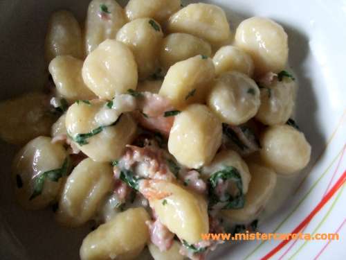 Ingredienti: 500 gr di gnocchi di patate - 400 gr di gorgonzola - 50 ml di latte - 150 gr di speck - 150 gr di rucola - 50 gr di parmigiano.