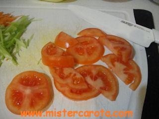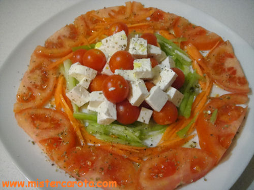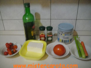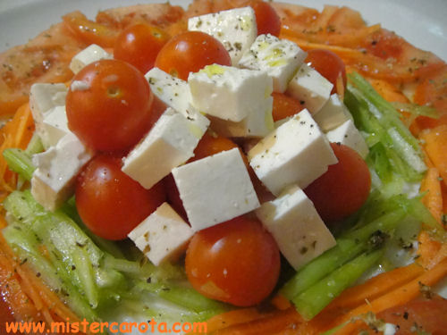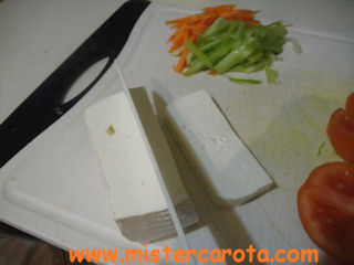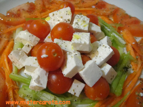 Ingredienti per 2 persone: 200 gr di formaggio "primo sale" (formaggio fatto da pochi giorni, vedi Formaggio fatto in casa con latte crudo o il Formaggio fatto in casa con latte pastorizzato) - 1 pomodoro tondo maturo ma sodo - un piccolo grappolo di pomodori ciliegini - una carota - 1 gambo di sedano - olio extravergine d'oliva - sale - pepe - origano.