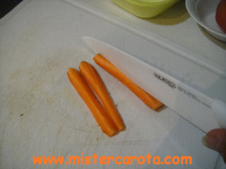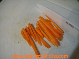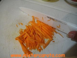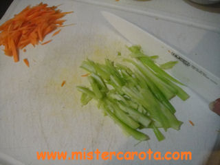 Tagliare a julienne o a bastoncini sottili la carota e il sedano.
