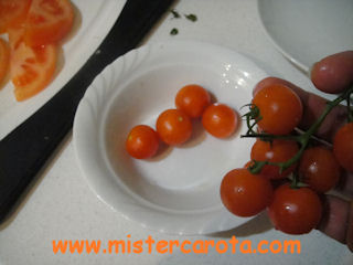 Lavare, asciugare i pomodorini ciliegini e staccarli dal grappolo.