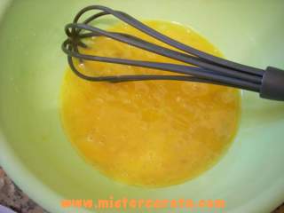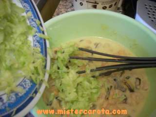 Pulire le cozze a crudo, filtrare l'acqua e tenerla da parte. Oppure metterle in un tegame, coprire con un coperchio e farle aprire sul fuoco. Eliminare i gusci e filtrare l'acqua. Prendere una ciotola mettervi le uova sgusciate, un po' di acqua delle cozze e batterle un po'.