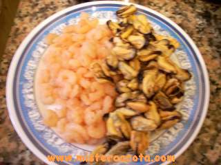 Preparare le cozze ed i gamberetti fatti prima sbollentare per alcuni minuti