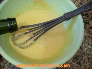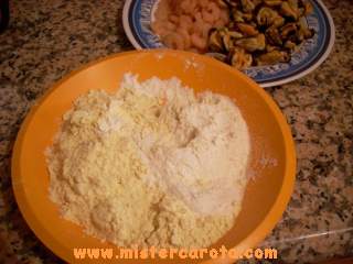 Le farine: metà di ceci metà farina 00, mescolarle per bene, unirle alle uova