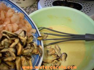 Ora mettervi le cozze ed i gamberetti, mescolare bene il tutto.