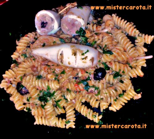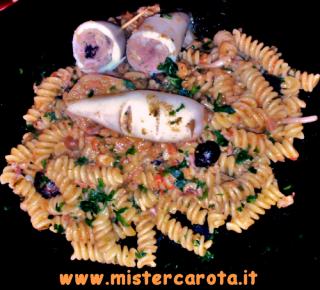 Prendete i ciuffi dei totani, la mortadella, il filetto di acciuga e riducete il tutto a pezzi piccolissimi, con il trito ottenuto fate un impasto con il tonno, i pinoli, l'uvetta, l'uovo, il pane strizzato del latte in eccesso, le olive, i capperi, un po' di prezzemolo, poco aglio tritato, il pecorino romano e una spolverata di pepe, regolate di sale ma fate attenzione perché il composto è già saporito.