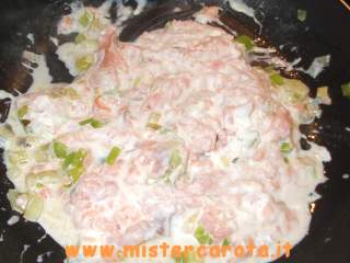 In una padella fate soffriggere il porro, aggiungete la philadelphia e fate amalgamare il tutto. Fate cuocere per 5 minuti, poi aggiungete il salmone fate appena scottare.