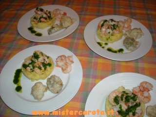 Sistemare sopra alle patate alcuni gamberoni, e condire con la salsetta verde.
