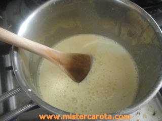Poi aggiungere tutto il resto del latte continuando a mescolare. Mettere sul fuoco la crema di nocciole ottenuta continuando a mescolare sino a scaldarla molto ma senza farla bollire.