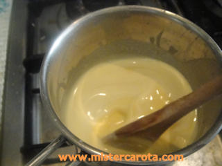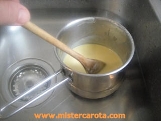 Appena la crema inizia ad addensarsi leggermente, allora togliere dal fuoco. Metterla in una sorta di bagnomaria con acqua fredda, mescolando, per farla freddare più velocemente.