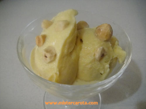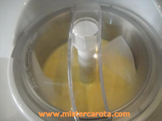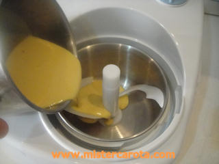 Versare il composto nella gelatiera e avviarla. Se non si ha la gelatiera, mettere il composto in freezer ed ogni 20-30 minuti frullarlo e rimetterlo in freezer sino a che il gelato non si sia rassodato.