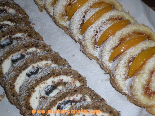 Dopo circa 3 ore, ho tagliato i due rotoli a fette spesse 1 cm e 1/2 circa, le ho posizionate su un vassoio e ho decorato le girelle alla confettura, con delle fettine di pesca sciroppata, quelle alla crema di mascarpone, con l'uvetta ricoperta al cioccolato.
