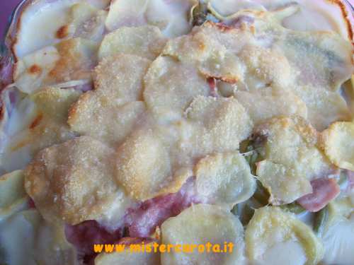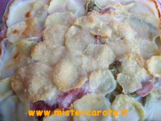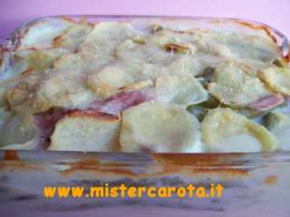 Uno strato di lamelle di patate, qualche fagiolino, un po' di prosciutto, un p? di besciamella e una sottiletta spezzettata.