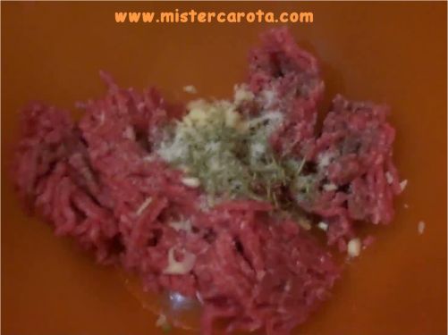 Impastare la carne con la salsiccia spellata, gli aromi e le spezie (ad es. aglio, rosmarino, origano...), sale e pepe.