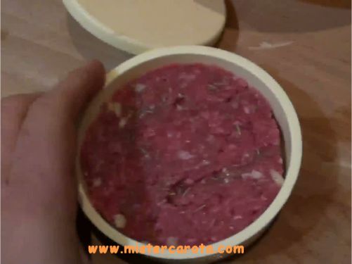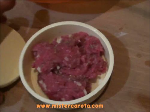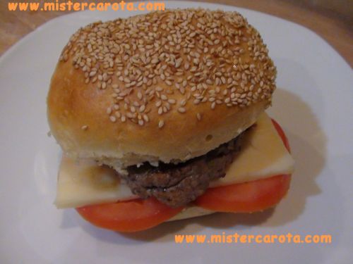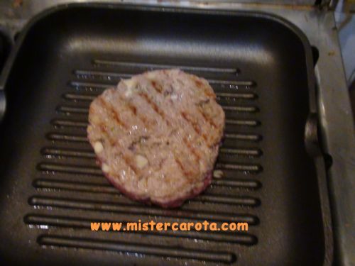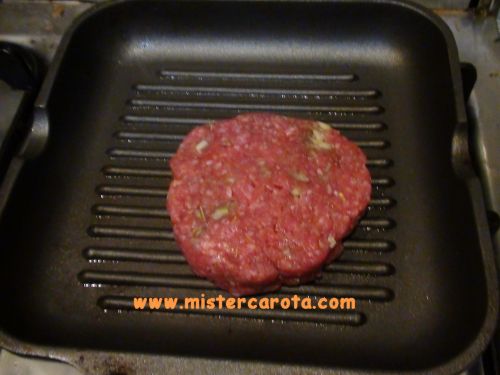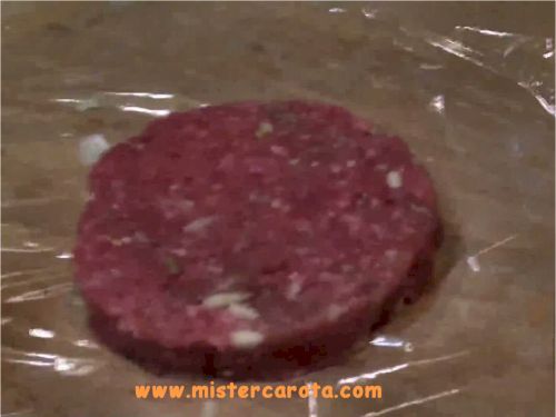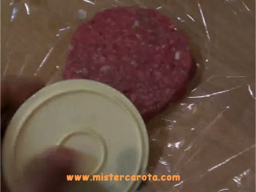 Ingredienti per 1 persona: panino per hamburger - 1 fetta sottile di formaggio Asiago - 2 o 3 fettine di pomodoro rosso maturo ma sodo - carne di manzo tritata - 1 salsiccia di prosciutto ogni 300 gr di carne di manzo - odori e spezie a piacere - sale - pepe.