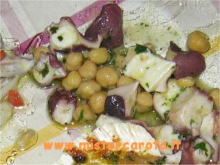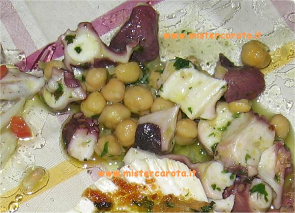 Ingredienti: 1 polpo (polipo) - olio extravergine d'oliva - sale - succo di limone - sale - pepe - prezzemolo - 500 gr di ceci precotti - polvere di curry.