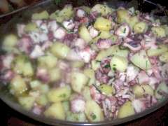 Ingredienti per 10 persone: 2 polpi da 1 kg circa - 1 kg di patate - olio extravergine d'oliva q.b. - erba cipollina - erba aglina - prezzemolo - basilico.