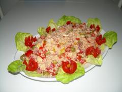 Ingredienti: 800 gr di riso per insalate - 200 gr di prosciutto cotto - 100 gr di gruviera olandese - 3 mozzarelle - 20 olive verdi snocciolate - 1 falda di peperone rosso - 1 falda di peperone verde sott'olio - 4 pomodori maturi e sodi - 300 gr di code di gamberi argentini - 1 kg di vongole o arselle - 3 moscardini - 1 limone non trattato - 1 cucchiaio d'aceto balsamico di Modena - 1 bicchiere di vino bianco - 1 spicchio d'aglio - olio extravergine d'oliva - sale.