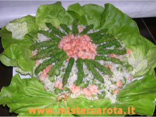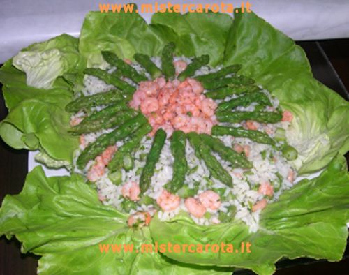 Versare il riso sulle foglie di insalata, nel centro del piatto, guarnire con il resto dei gamberetti, le punte degli asparagi e versarci sopra il resto della salsa.