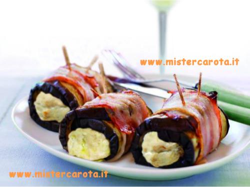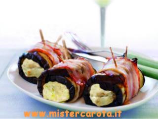 Ingredienti: 1 melanzana - pancetta tagliata a fettine sottili - fontina - sale - olio - prezzemolo - pomodorini per guarnire.