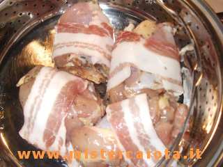 Ingredienti: 4 petti di pollo - 4 fette di pancetta - rametti di salvia - sale - pepe e prezzemolo.