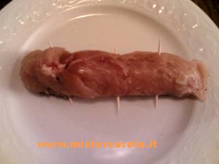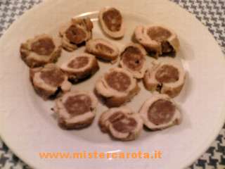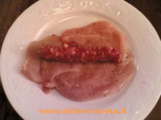 mettete una salsiccia lunga al centro e arrotolate chiudendo poi con degli stuzzicadenti.