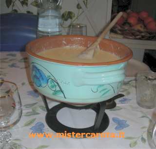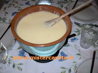 Ingredienti per 4-6 persone: 300 gr di gruyère - 240 gr di emmenthal - 200 gr di tilsit - 350 gr di vacherin - 450 ml di vino bianco secco - 1 bicchierino di grappa di ciliegie - 2 cucchiaini di fecola di patate - pepe e noce moscata a piacere - 1 spicchio d'aglio per sfregare il fondo di una pentola di terracotta.