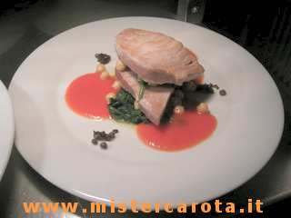 Due trance di tonno freschissimo leggermente grigliate, salate e pepate, una spruzzatina di limone durante la cottura. Avrò saltato degli spinaci con un profumino di aglio ed olio di oliva, avrò anche preparato precedentemente una salsetta leggera di pomodoro casomai leggerente piccante e dei ceci ammollati e cotti. Sul piatto individuale metto un po' di salsa di pomodoro, un ciuffetto di spinaci, ci monto una scaloppa di tonno, ancora spinaci, una cucchiaiata di ceci, ancora una scaloppa di tonno, un filino di olio di oliva (ma di quello buono eh!), decoro con gusto e... servo subitissimo. Buon appetito!