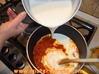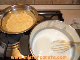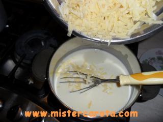 Preparate una besciamella abbastanza fluida (con burro, farina latte, panna, noce moscata e sale), poi aggiungetevi il gruviera grattugiato e fatelo sciogliere mescolando con la frusta fino ad ottenere una crema.