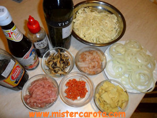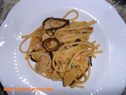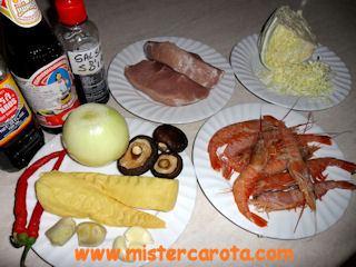 Ingredienti per 5 persone: 400 gr di linguine cotte al dente in brodo di pollo - 150 gr di lonza di maiale tagliata a striscioline - 150 gr di gamberi sgusciati e divisi a metà - 150 gr di germogli di bambù affettati - 1/2 di cuore di cavolo verza affettato sottilissimo - 4 funghi shijtake ammollati ed affettati finemente - 1 cucchiaio di zenzero tritato - 2 peperoncini piccanti tritati - 2 spicchi d'aglio tritati - 1 grande cipolla affettata a rondelle - 4 cucchiai di Sherry (o di vino di riso) - 2 cucchiai di salsa di pesce - 1 cucchiaio di salsa di ostriche - 3 cucchiai di salsa di soia scura - olio di semi q.b.