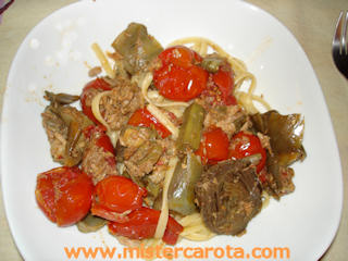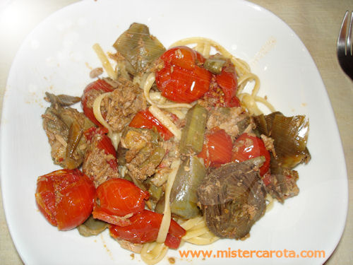 In una padella fate soffriggere l'aglio in un po' d'olio. Toglietelo e versate i pomodorini. Fate cuocere a fiamma alta per 5 minuti con un pizzico di sale. Aggiungete il tonno ed i carciofi puliti e tagliati a fette, fate cuocere per altri 15 minuti, se occore aggiungete 1/2 bicchiere di acqua.